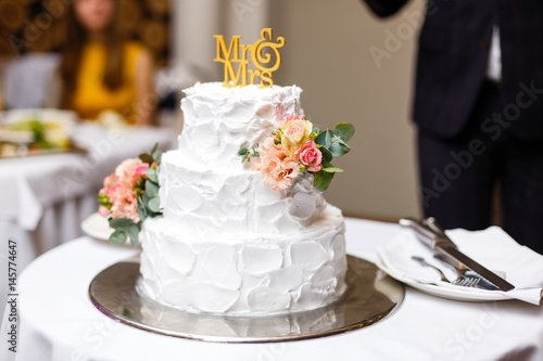 Beautiful Three Tiered White Wedding Cake Decorated With Flowers