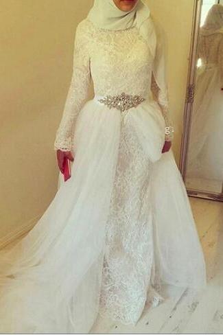 2015 Latest Long Sleeve Lace Removable Train Hijab Muslim Wedding